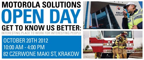 Firma Motorola Solutions po raz kolejny organizuje Dzień Otwarty w swoim Centrum Oprogramowania w Krakowie. Odbędzie się w dniu 20 października 2012 (sobota) w godz. 10:00 – 16:00, ul. Czerwone Maki 82, Kraków.